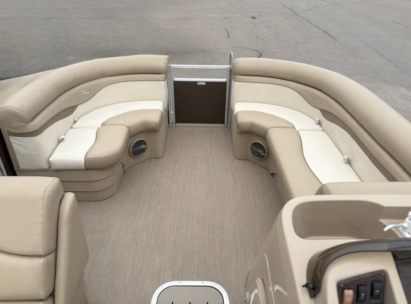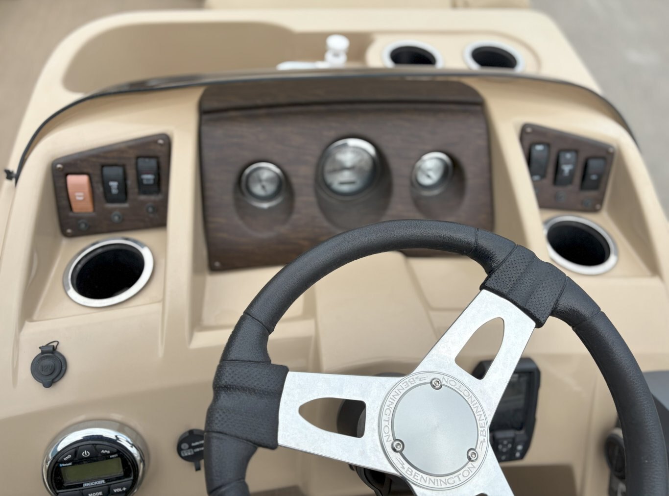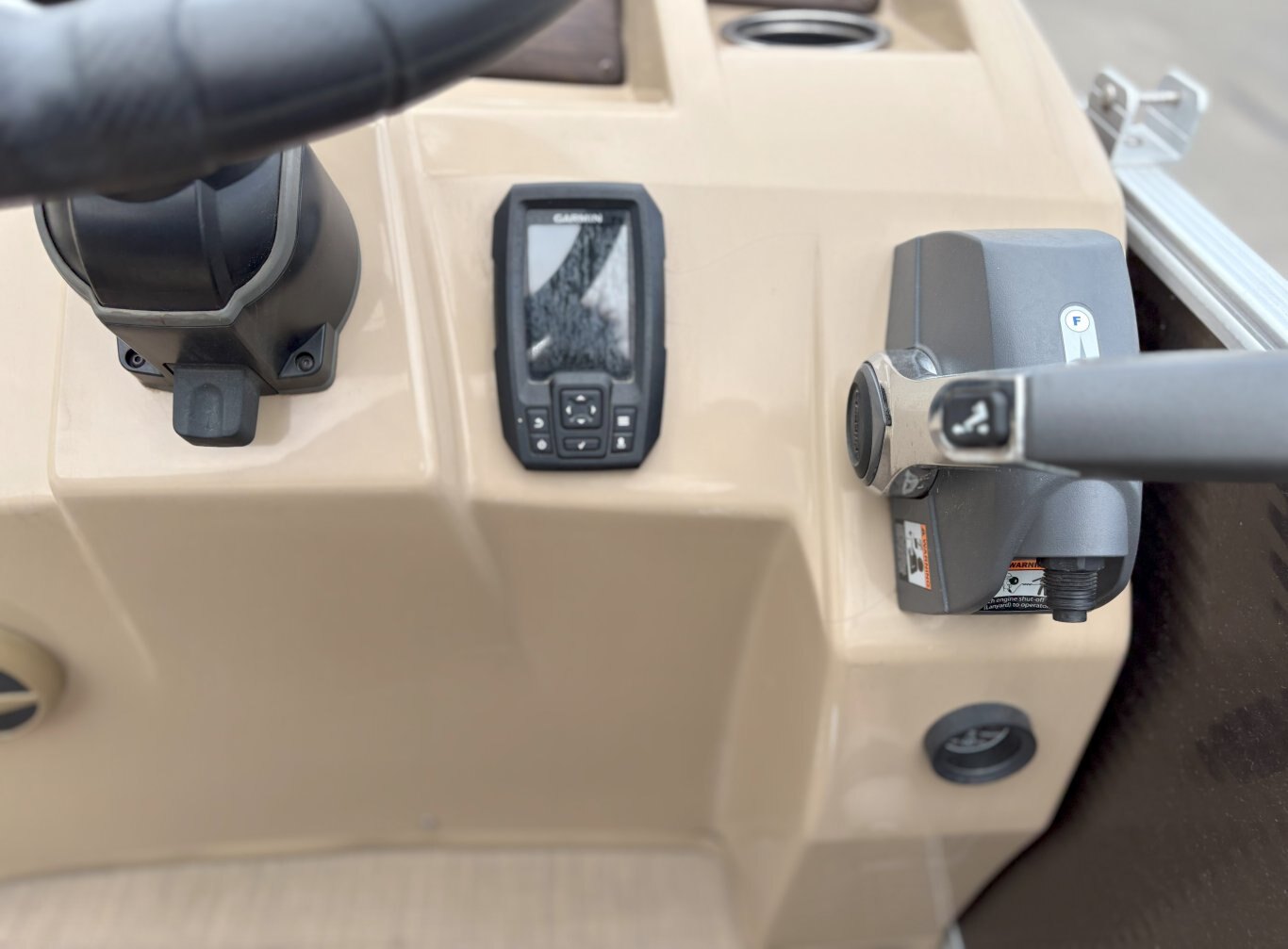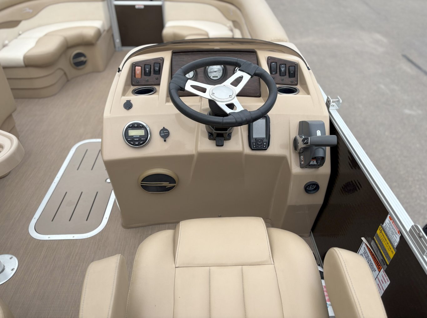 Console & Controls: Fiberglass console with polished steering wheel, gauges, hour meter, courtesy lighting, and custom switchgear