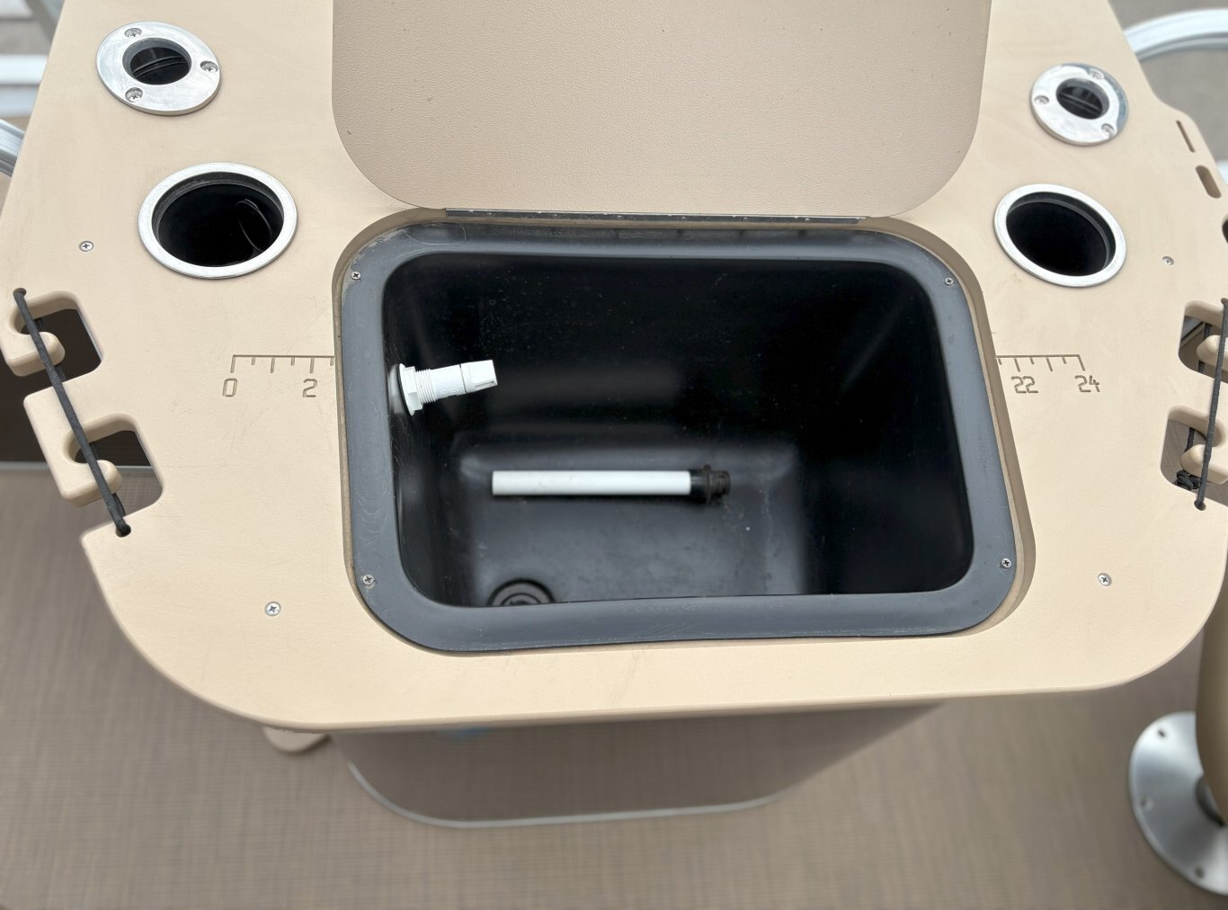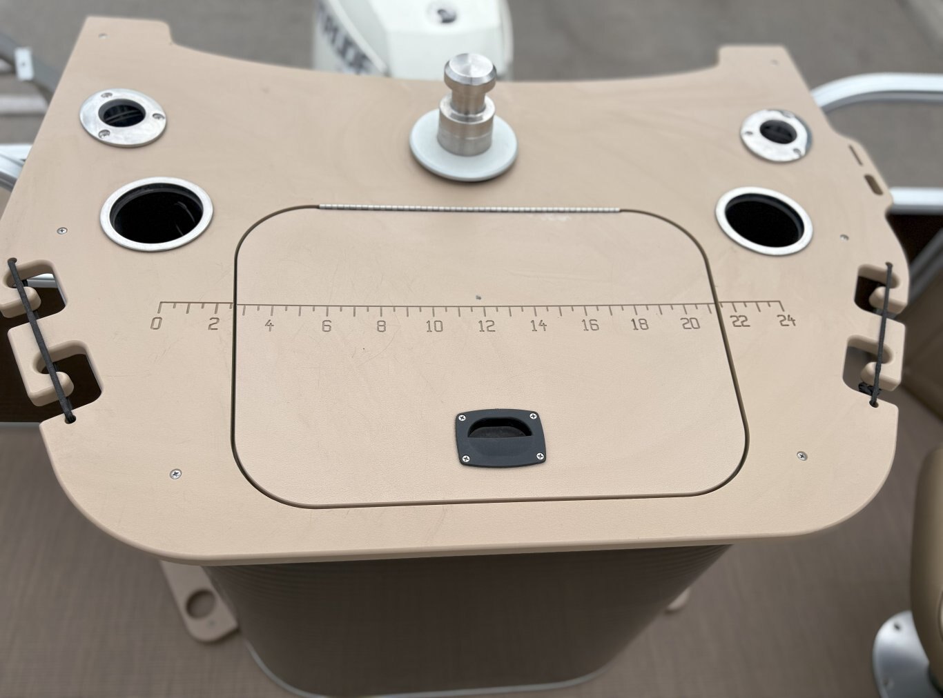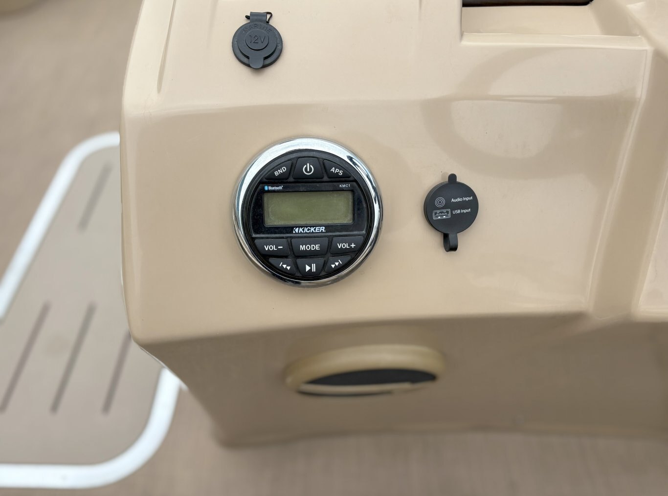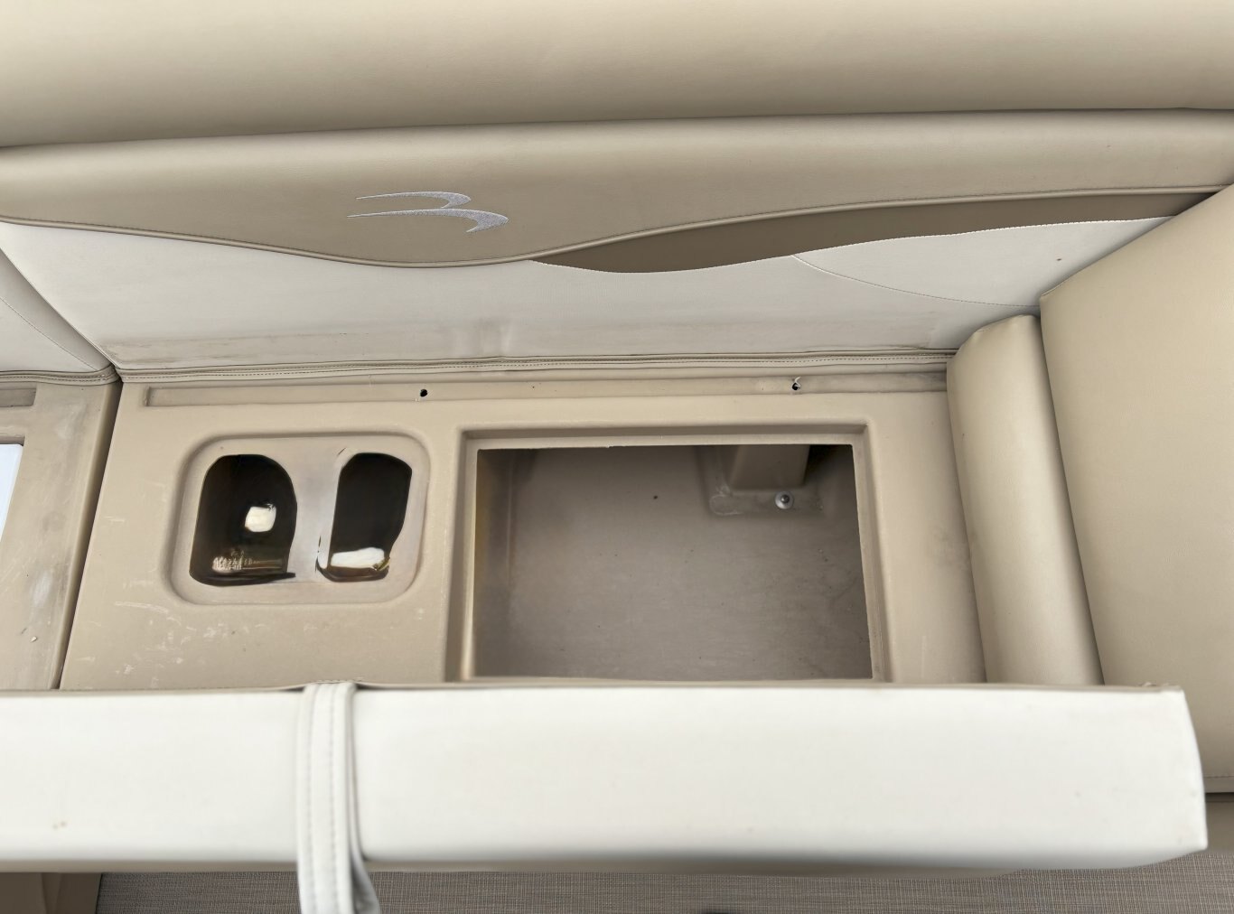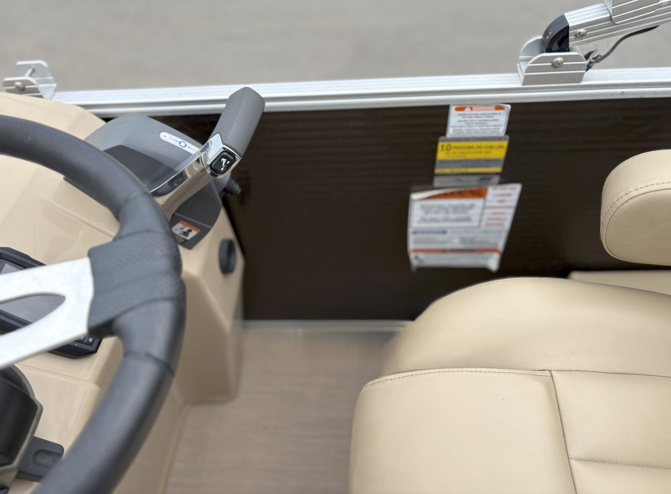Console & Controls: Fiberglass console with polished steering wheel, gauges, hour meter, courtesy lighting, and custom switchgear