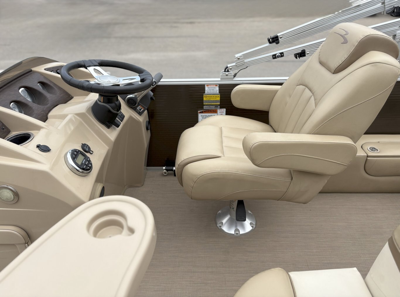 Interior Amenities: Features like espresso teak tables, captain and co-captain reclining helm chairs, audio speakers, woven vinyl flooring, and more contribute to a luxurious experience