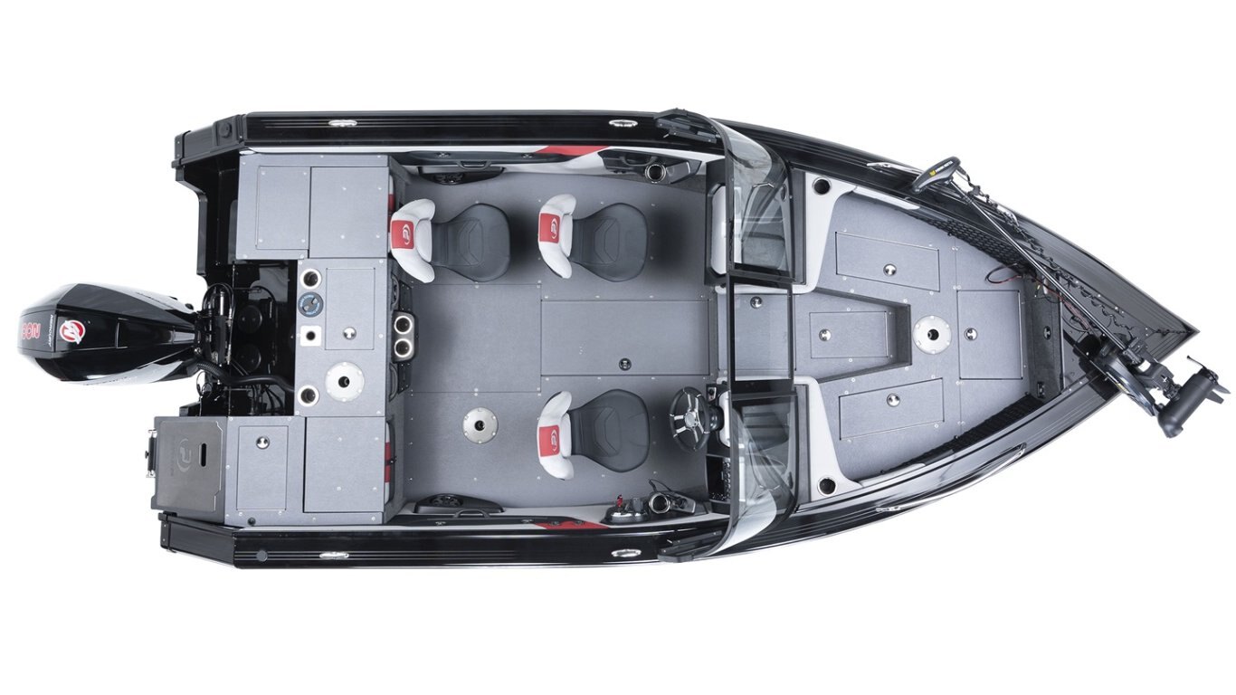 Twin consoles with steering system Glove box Drawer under passenger console Black anodized walk-thru tempered glass with hidden frame windshield Deluxe dash panel with switches and indicator lights SeaStar hydraulic steering system with tilt wheel Storage under driver console with extensible cargo net 200-watt AM/FM/Bluetooth Clarion Digital media center including an in-dash USB plug 4- 6 1/2" waterproof speakers with LED lights Electric horn and 12V outlet