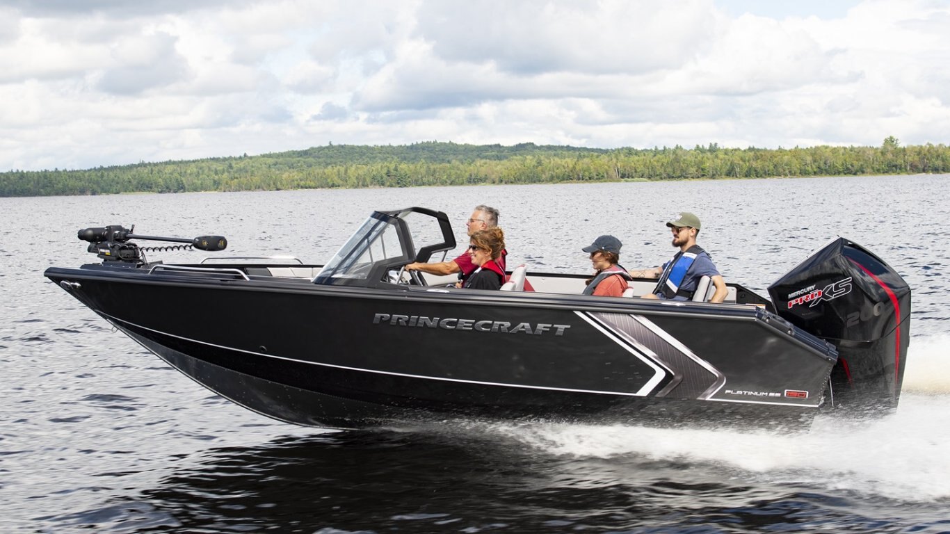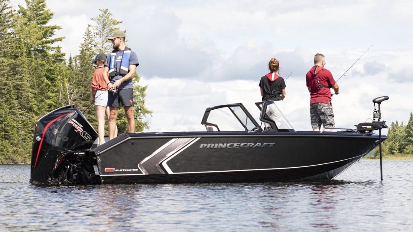 5052-H36 marine grade aluminum alloy Urethane exterior paint choices, with a metallic finish including decal package and 3D Princecraft chrome signature Double reverse chine hull design Deep self-draining splashwell Twin plating from bow to mid-ship Twin plating at the chine Rigging tube under flooring (from helm to bow) Rigging tube under flooring (from stern to helm) Stainless steel bow and stern eyes 4 stainless steel recessed cleats BOW RAISED CASTING PLATFORM Anchor storage compartment Extensible cargo nets Deep cycle battery storage compartment Integrated cooler Electric-filled aerated livewell Seat mount floor base Storage under bow deck AFT RAISED CASTING PLATFORM Battery storage compartment 2 fold-down jump seats Electric-filled aerated livewell Seat mount floor base Storage compartment