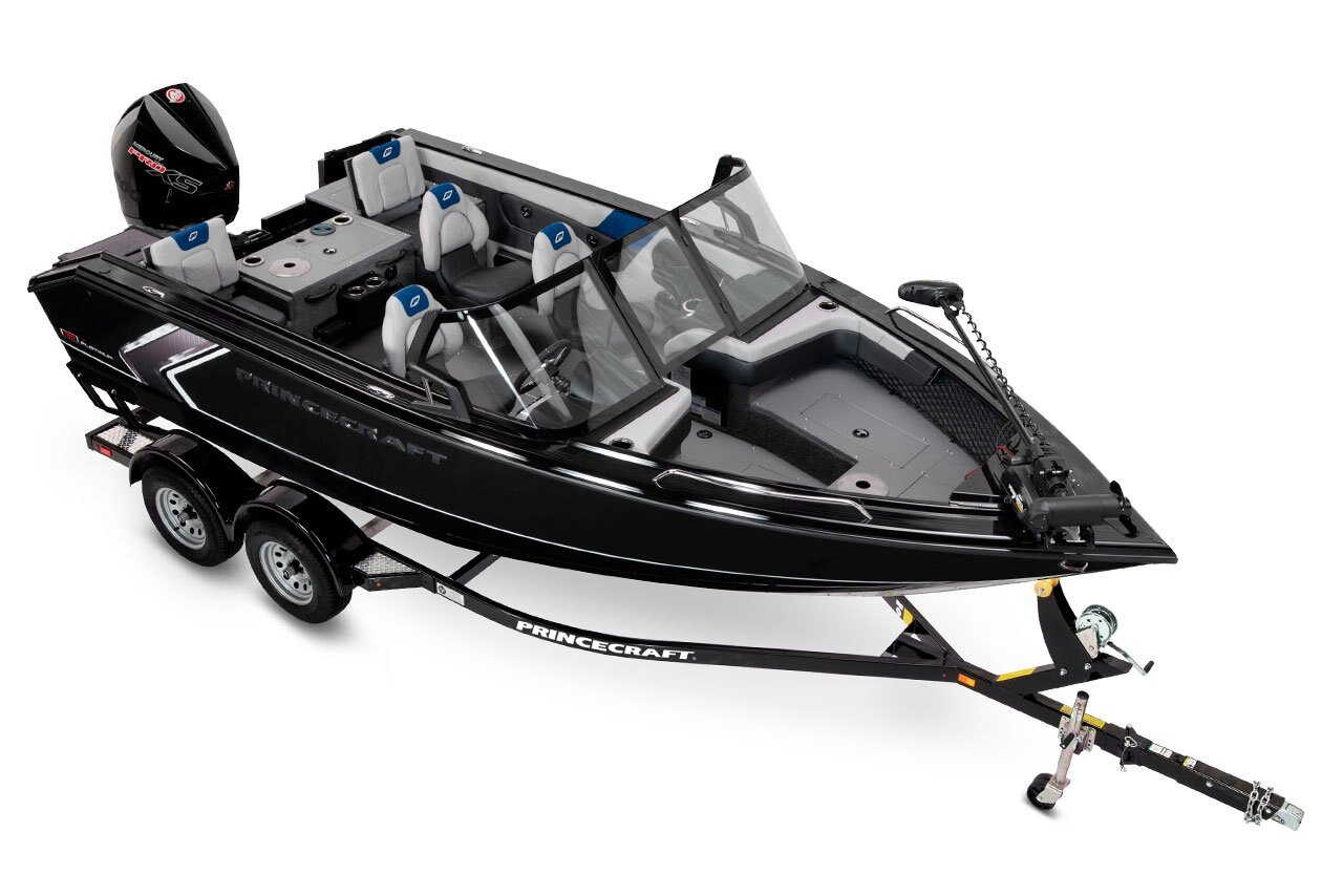 5052-H36 marine grade aluminum alloy Urethane exterior paint choices, with a metallic finish including decal package and 3D Princecraft chrome signature Double reverse chine hull design Deep self-draining splashwell Twin plating from bow to mid-ship Twin plating at the chine Rigging tube under flooring (from helm to bow) Rigging tube under flooring (from stern to helm) Stainless steel bow and stern eyes 4 stainless steel recessed cleats BOW RAISED CASTING PLATFORM Anchor storage compartment Extensible cargo nets Deep cycle battery storage compartment Integrated cooler Electric-filled aerated livewell Seat mount floor base Storage under bow deck AFT RAISED CASTING PLATFORM Battery storage compartment 2 fold-down jump seats Electric-filled aerated livewell Seat mount floor base Storage compartment