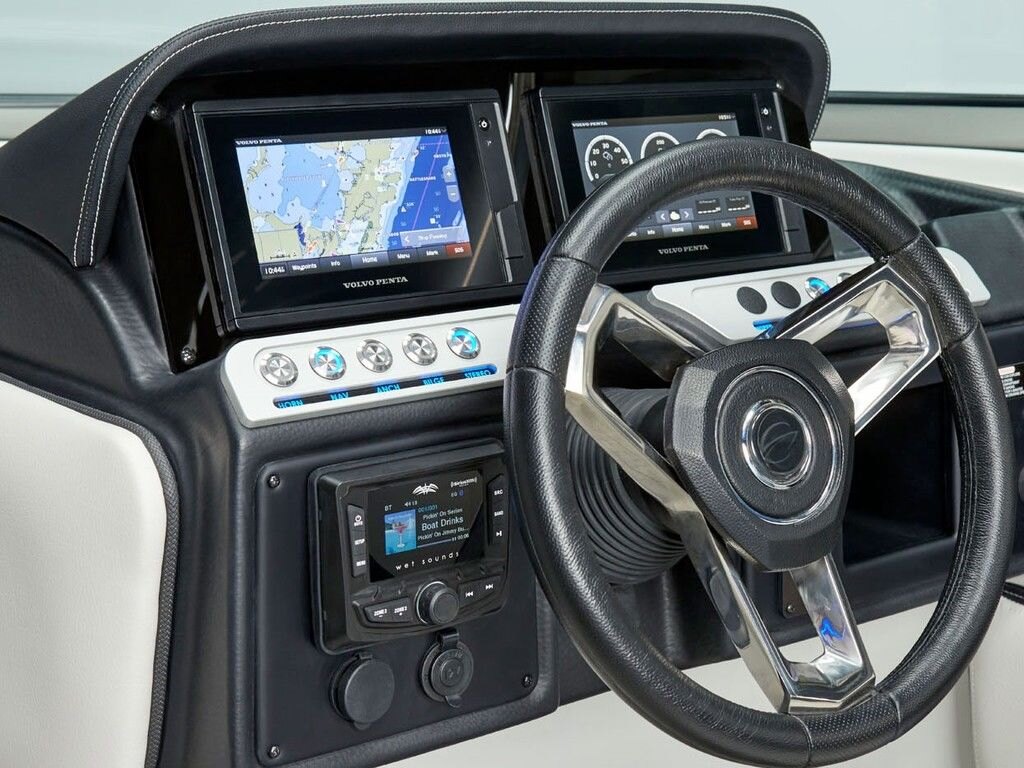 Interior: Lineage Pkg. (Moonstone, Onyx, & Color Matched Vinyl) Mat - Soft Touch Cockpit Snap In - Moonrock Dash - Black Shroud w/Double Stitch & S/Steel Switches & Billet Steering Wheel - Black Diamond Arch - Onyx Aluminum w?Electric Fold Down, Sun Top, & LED Lights Canvas - One Piece Mooring Cover w/Hangtyte Fender Clips - 4 Bases w/4 Inserts Lighting - LED Underwater Transom Mat - Swim Platform Moonrock Soft Touch Rubrail - S/Steel Insert w/White Extrusion Seating - Bow Filler Cushions Stereo - Wet Sounds Performance Amp System w/LED Lights in Black Arch Speakers & LCD Transom Remote Wakeboard - Talon Stationary Rack - 2 for Arch